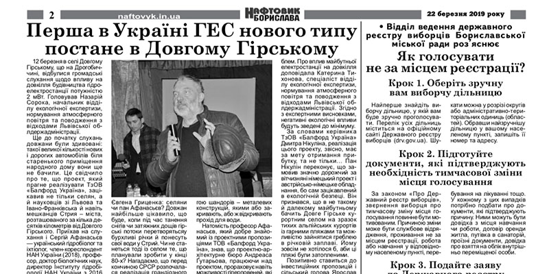 12 березня 2019 в селі Довгому Гірському, що на Дрогобиччині, відбулися громадські слухання щодо впливу на довкілля будівництва гідро-електростанції потужністю 2 мВт. Результати та висновки дивіться у представленній статті.